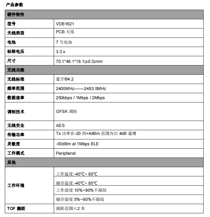 VDB1621 基于 Nordic BLE 4.2 芯片。其内部由 2 7 号电池供电,电池续航时间与 VDB1621 的广播参数有关,外部镜片用作测距透光,带防拆按键。